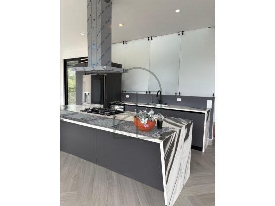 Luego ingresas a la casa donde tienes la zona social, la cocina de diseño contemporáneo, con isla central (incluye una campana extractora suspendida de acero inoxidable) con cubierta en mármol, El mesón lineal se complementa con lavaplatos doble, grifería moderna tipo monomando negra y electrodomésticos